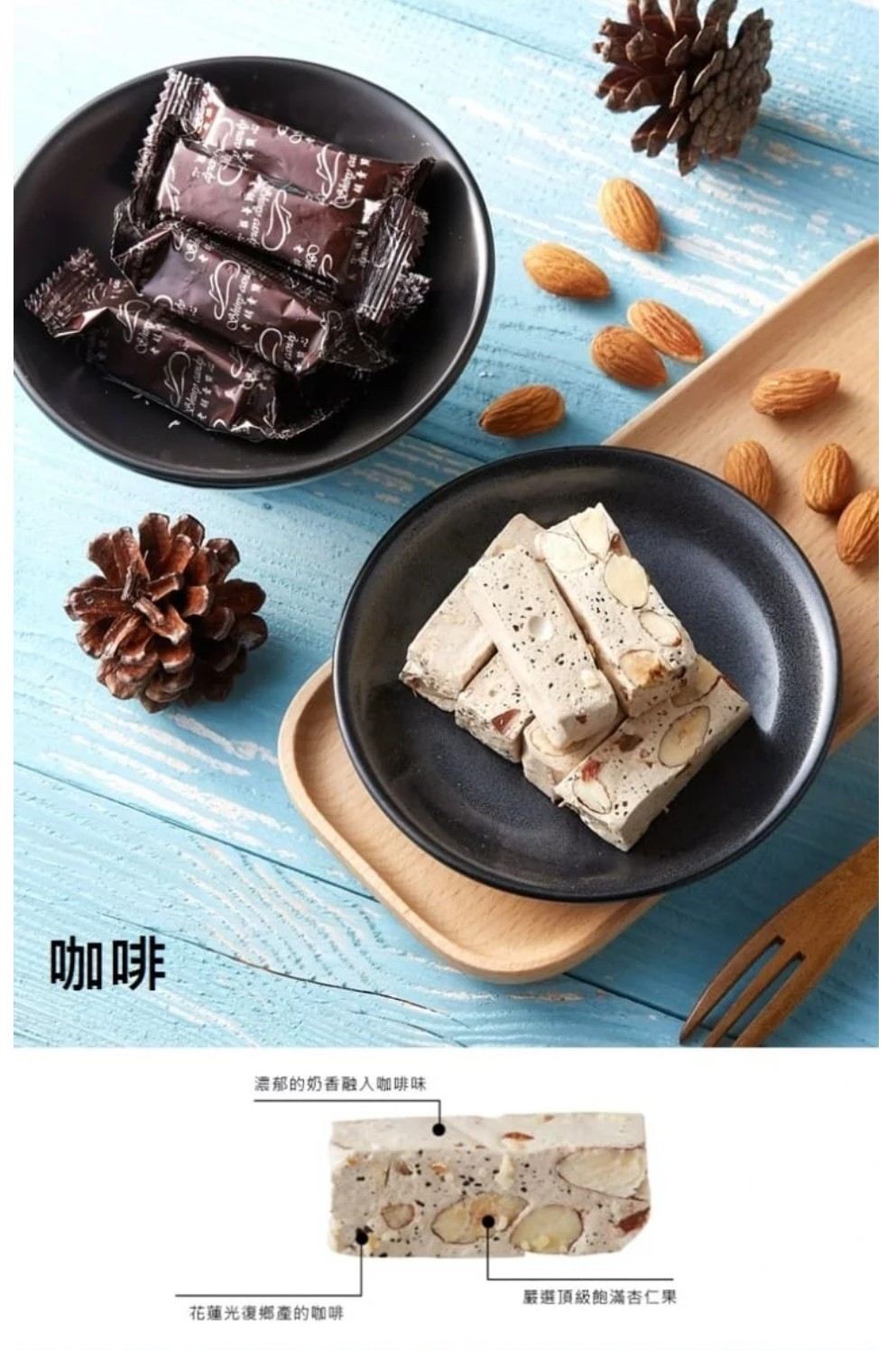 純手工製作,堅持純天然食材,豐富營養的杏仁果、花生、蔓越莓、咖啡鑲進牛軋糖磚中完美組合!質地軟Q不黏牙,越嚼越香!